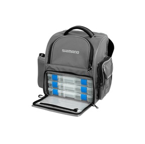 Mochila de marca Shimano, modelo Tackle Costas na cor cinzento e preto tamanho médio, especial para a pesca do robalo e dos predadores.