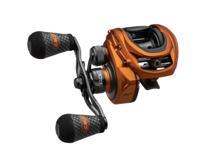 Carreto de casting da marca Lews modelo Esmagamento em preto e laranja, especialmente para a pesca do black-bass e dos predadores.