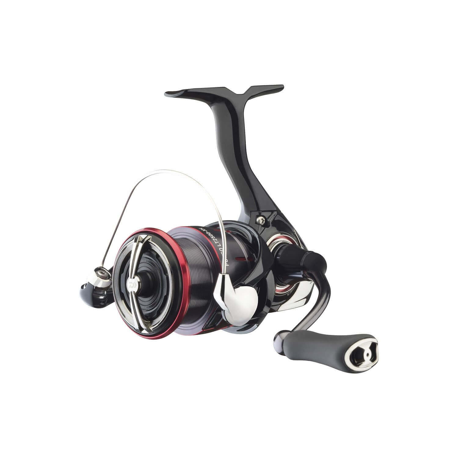 Carreto de Spinning da marca Daiwa gama Fogo 23 LT 2500 CXH com design preto, cinzento e vermelho, especiais para a pesca do robalo e dos predadores.