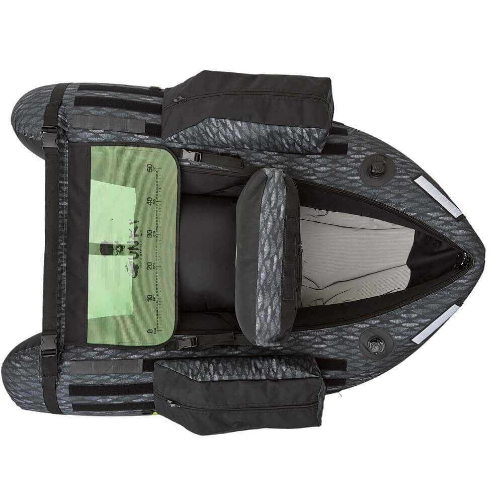 Float tube da marca Gunki modelo Furti-V em cores cinzento, preto e verdeespecial para a pesca do achigã e dos predadores.