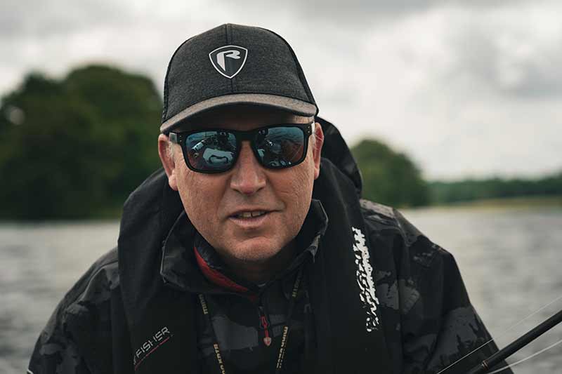Óculos polarizados da marca Fox Rage com armação colorida preto e lentes castanhas com acabamento espelhado em azul, perfeitas para a pesca do Black-Bass.