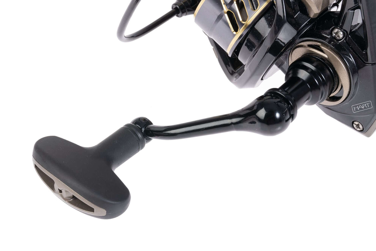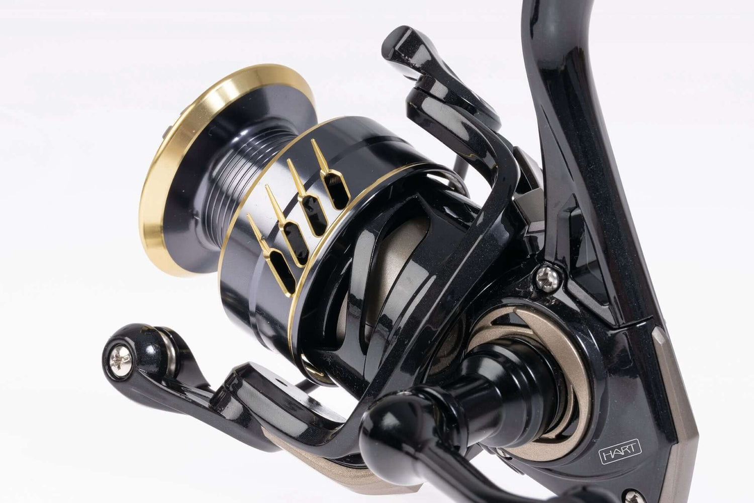 Carreto de spinning da marca Hart modelo Fiamma, na cor preto e dourado, especial para a pesca do black bass e dos predadores.