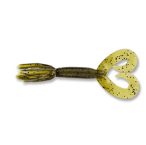 Vinil de 127 mm da marca Yamamoto modelo Double Tail Hula Grub cor verde com manchas preto, especial para a pesca do black bass e dos predadores. Caracteriza-se pelo seu duplo movimento da cauda e pelas suas franjas, ideais para a montagem de diferentes formas. Devido à sua forma única, este vinil mantém-se no fundo e proporciona muita ação.