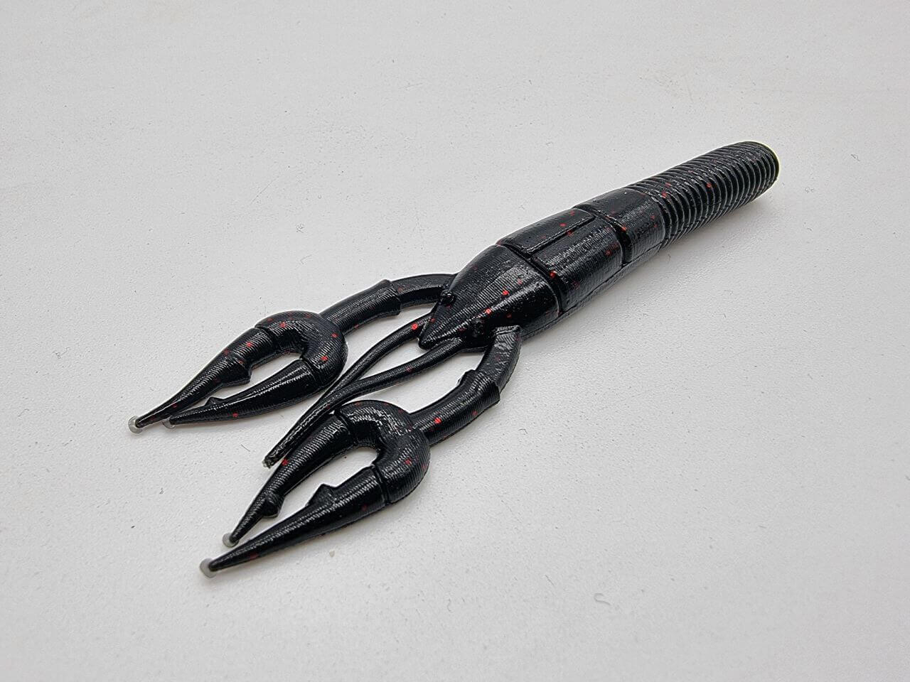 Vinil de caranguejo de 95 milímetros y 7 gramas peso da marca Yamamoto modelo Fat Baby Craw cor preto com riscas vermelhas, especial para a pesca do robalo e dos predadores. Tem um corpo redondo e garras. Está impregnada de sal.