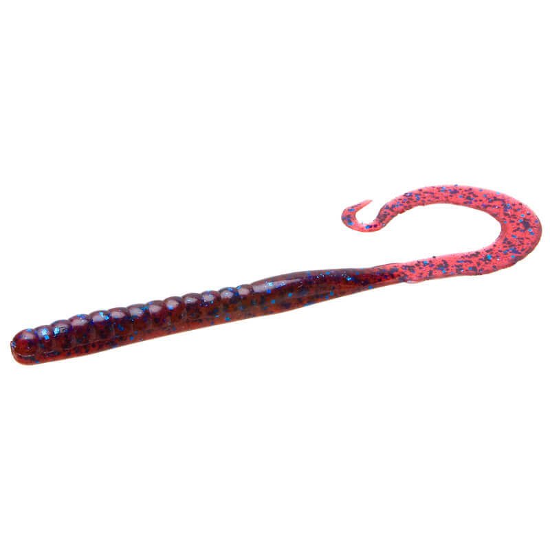 vinil em forma de verme de 225 milímetros da marca Zoom Mag 11 cor vermelho com com manchas azuis. Trata-se de um verme grande, de corpo sólido e cauda ondulada. Está impregnado de sal.