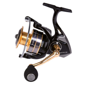 Carreto de spinning da marca Iridium, modelo Satis FD, na cor preto e dourado, especial para a pesca do black bass e dos predadores.