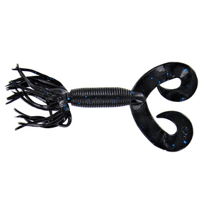 Vinil de 127 mm da marca Yamamoto modelo Double Tail Hula Grub cor preto com manchas azul, especial para a pesca do achigã e dos predadores. Caracteriza-se pelo seu movimento duplo da cauda e pelas suas franjas, ideais para a montagem de diferentes formas. Devido à sua forma única, este vinil mantém-se no fundo e proporciona muita ação.
