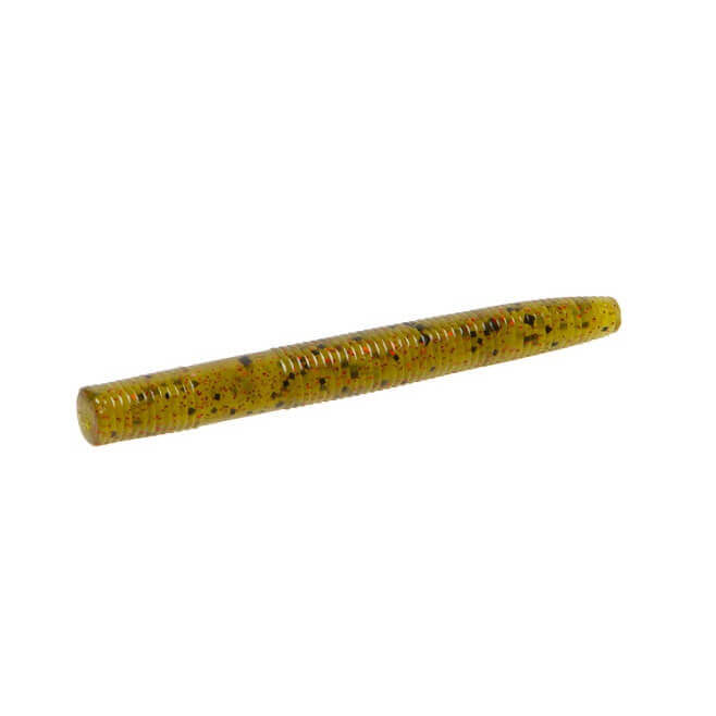 Isco de vinil com forma de minhoca de 85 milímetros da marca Zoom modelo Beatdown cor verde com riscas vermelhas. Trata-se de um isco fino, macio, duradouro e de ação rápida. Está impregnado de sal.