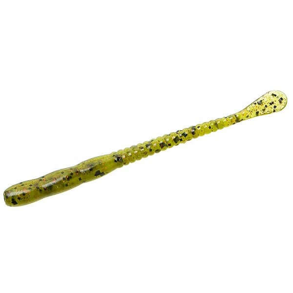 Vinil fino de 100 milímetros da marca Zoom modelo Cabeça de carne, cor verde com marcas pretas e vermelhas, especial para a pesca do robalo e dos predadores. É impregnada de sal.
